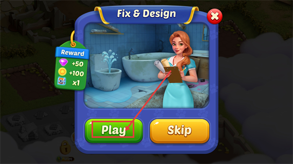 1、点击【Play】按钮进入关卡,完成后可获得【+50宝石】【+100金币】及道具奖励,助力装修进度。