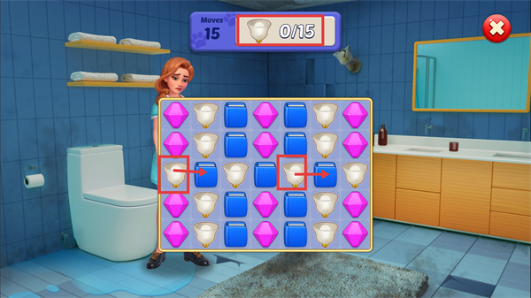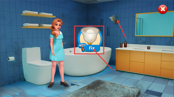 2、关卡目标是修复浴室,点击带有灯泡图标的【Fix】按钮,触发消除关卡以推进修复任务。
