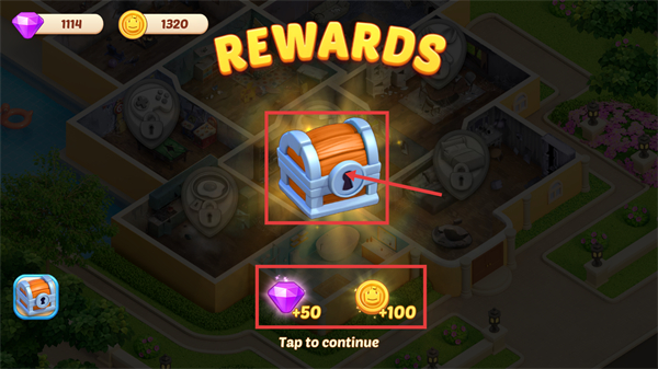 4、通关后解锁宝箱,可获得【+50宝石】【+100金币】,点击【Tap-to-continue】领取并继续装修。