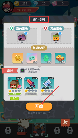 1、进入【第1-3关】前,先查看【通关击杀】-【赏金击杀】目标,选【备战】栏适配武器,再点【开始】挑战。