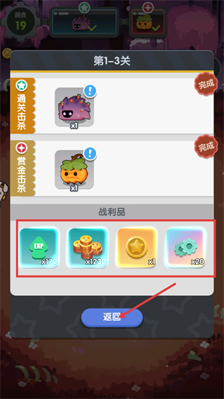 4、通关后可获得【EP】-金币-齿轮等战利品,点击【返回】后可准备下一关挑战。