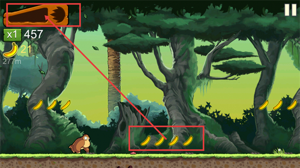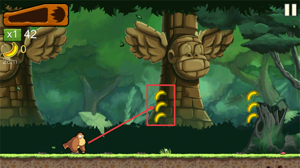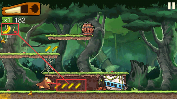 1、在丛林场景中,控制角色移动收集沿途的香蕉,优先获取密集分布的香蕉堆,快速积累数量。