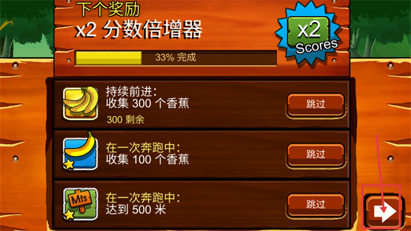 4、查看任务界面的目标(如收集300个香蕉),完成后可解锁【x2分数倍增器】,点击箭头按钮继续游戏。
