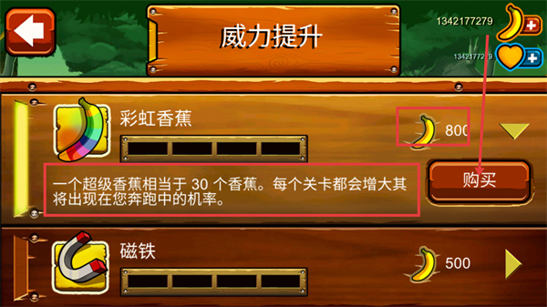 1、在【威力提升】界面中,用80个香蕉购买【彩虹香蕉】,其等效30个普通香蕉,关卡中出现概率更高。