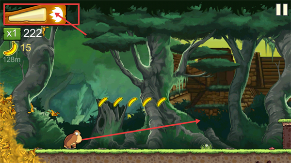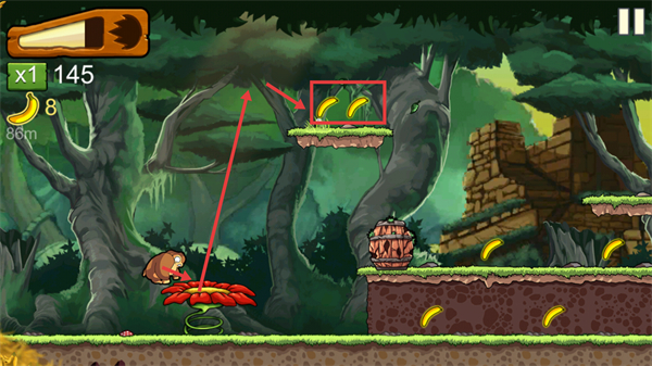2、奔跑过程中,利用弹簧类道具可跳至高处平台,获取平台上的香蕉,同时注意场景中的障碍。