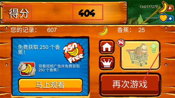 4、结算界面中,可通过观看广告免费获取250个香蕉,也可点击【再次游戏】快速重开对局。