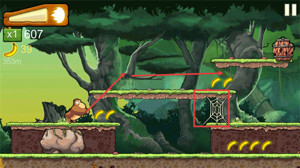 1、遇到【蛛网】类障碍时,可借助平台跳跃避开,同时收集周围香蕉,推进至353m及更远距离。