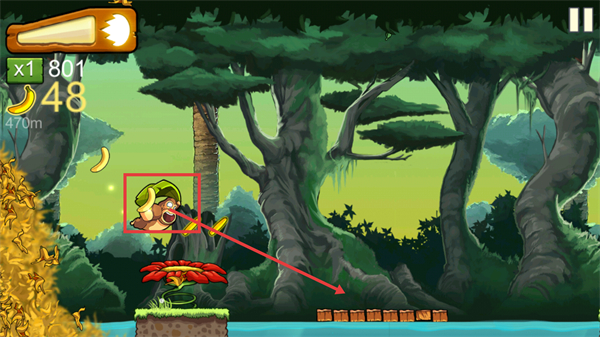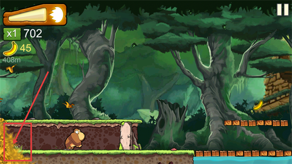 2、注意场景中的火焰区域,需绕行避免接触,同时利用地形间隙移动,积累香蕉至45个。