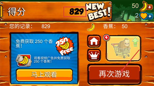 4、结算时若达成【NEW-BEST!】新纪录,可选择观看广告获取250个香蕉,或点击【再次游戏】刷新成绩。