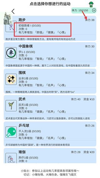 1、在主界面点击【运动】按钮,可进入运动选择界面,参与运动以提升各项属性。