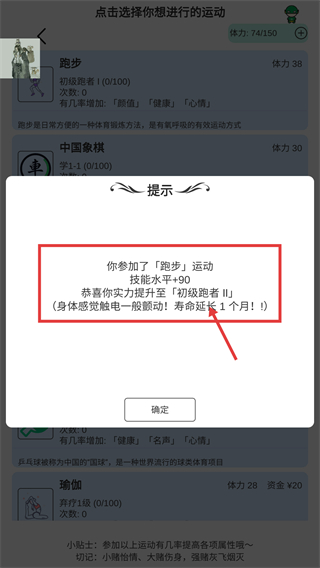 3、完成【跑步】运动后,会触发提示框显示技能升级与寿命延长,点击【确定】关闭弹窗即可。