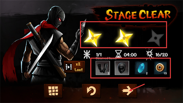 4、通关后查看【STAGE-CLEAR】界面,领取【装备-2】【宝石-2】等奖励,可选择进入下一关。