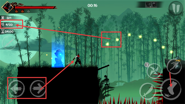 1、操控【←→】方向键移动角色,靠近场景中发光点收集道具,推进【4/20】进度,注意限时【04:00】。