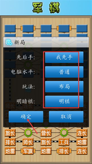 1、开局设置选择【我先手】+【普通】电脑水平+【明棋】玩法,新手可快速熟悉棋子克制关系,点击【确定】开启对局。