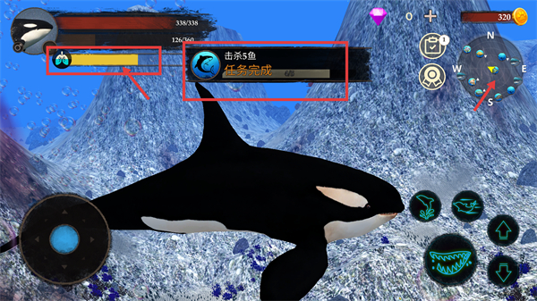 2、关注【击杀5鱼】任务进度(当前2/5),优先捕猎小型鱼类完成任务,同时积累金币提升虎鲸属性。