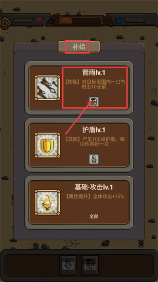 2、在【补给】界面优先解锁【箭雨lv.1】,其【技能】可对范围射出10支箭,适合清理集群敌人。