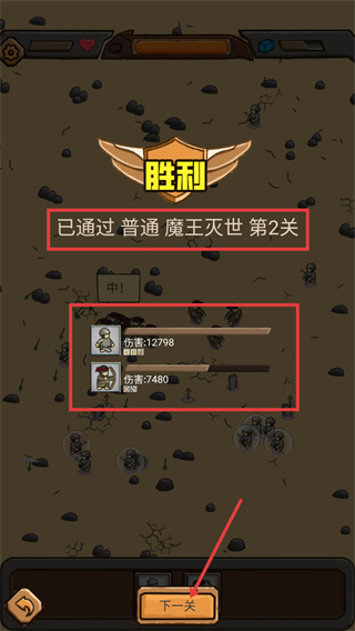 4、通关【普通-魔王灭世-第2关】后,查看伤害数据(如【12798】),调整阵容后点击【下一关】推进。