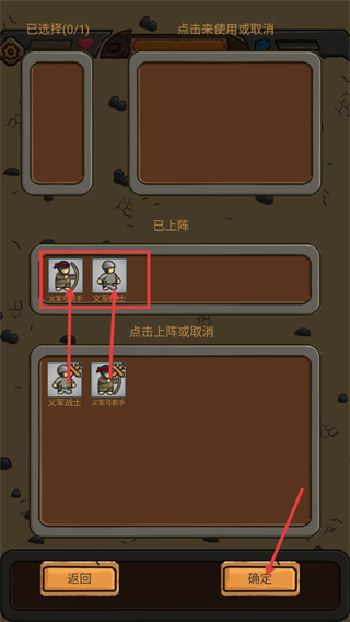1、在阵容配置界面,选择【义军弓箭手】与【义军战士】点击上阵,搭配后点【确定】完成阵容设置。