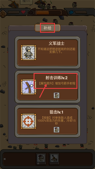 3、在【补给】界面升级【射击训练lv.2】,其【属性提升】可增加弓箭手射程,强化远程输出能力。
