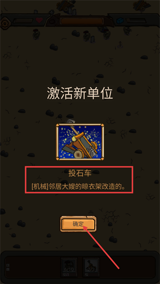 4、激活新单位【投石车】(机械类,由邻居大嫂的晾衣架改造)后,点击【确定】将其加入可用阵容。