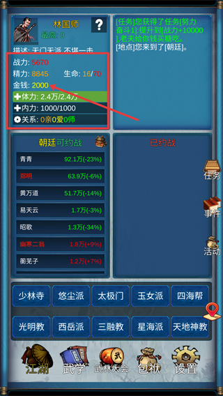 3、9大江湖地点各具特色,门派高手与游历侠客随机出现,特殊情节触发概率差异化,探索充满变数。