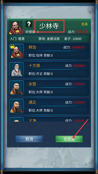 2、选择【少林寺】门派后点击【去这里】可进入该门派场景,其入门武学为【棍意】,后续可参与【金棍试炼】等玩法。