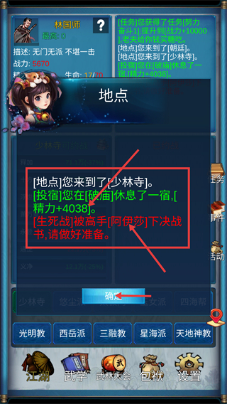 3、抵达少林寺后在破庙投宿可恢复【精力+4038】,同时会触发【生死战】事件,需准备应对高手【阿伊莎】的决战。