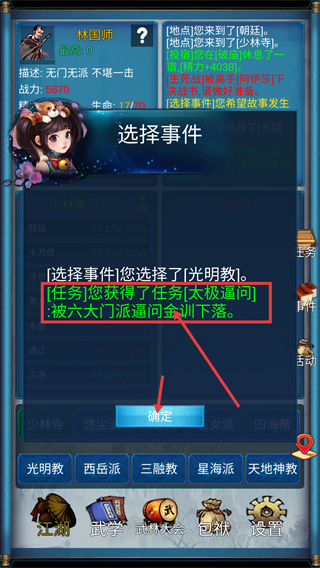 4、选择【光明教】事件后会获得【太极逼问】任务,需应对六大门派追问金训下落,完成后可推进剧情与获取奖励。