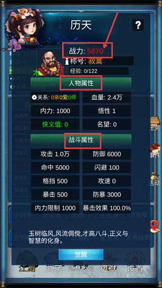 1、查看【人物属性】与【战斗属性】可了解自身【战力-5670】等数值,后续可通过提升属性来增强实战能力。