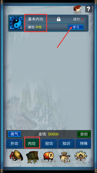 2、在武学界面切换到【内功】分类,点击【学习】可解锁【基本内功】,该功法属性为中性,是基础武学之一。