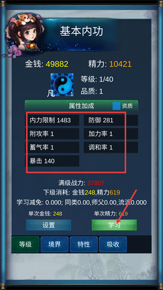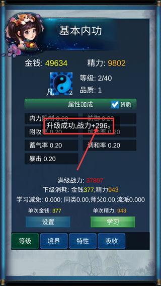 3、学习【基本内功】后,等级1可获得【内力限制-1483】等属性加成,升级需消耗金钱与精力,满级战力提升显著。