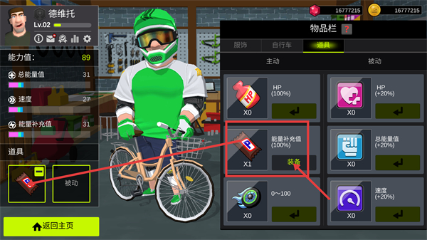 1、在物品栏的【道具】分类下,点击【能量补充值-(100%)】道具旁的【装备】按钮,可提升对应属性。