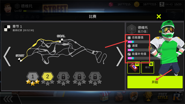 2、进入【比赛】界面后,确认【总能量值】【速度】等属性状态,再点击【开始】按钮参与【章节1】赛事。