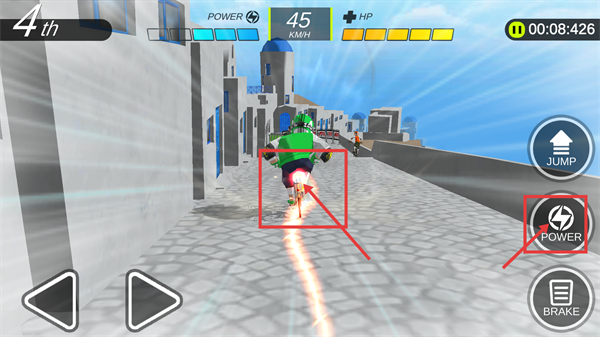 3、比赛过程中,点击右侧【POWER】按钮可触发加速效果,配合【JUMP】键应对赛道障碍,提升排名。