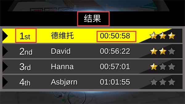 4、比赛结束后查看【结果】界面,若获得【1st】名次与三星评价,可解锁更高难度赛事的条件。