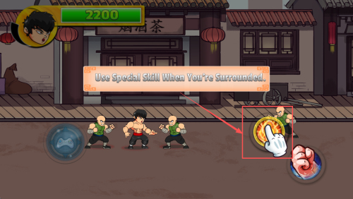 3、使用技能:当被敌人包围时,点击右侧的技能按钮来释放特殊技能,击败敌人。