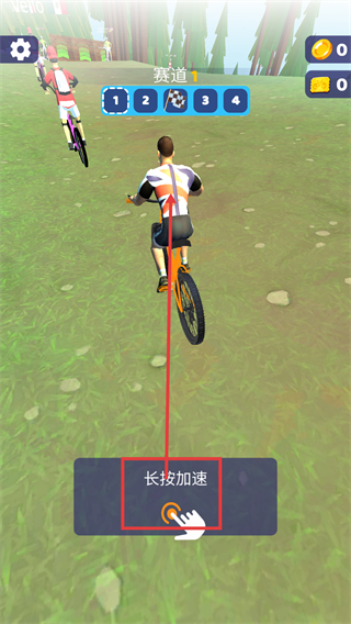 1、在【赛道1】中,持续点击【长按加速】按钮提升车速,可快速缩小与前方选手的距离,抢占更优排名。