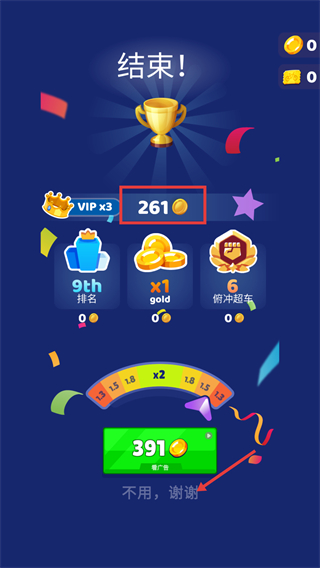 4、比赛结束后获得【261】金币,可选择观看广告翻倍奖励,或点击“不用,谢谢”直接领取基础奖励。
