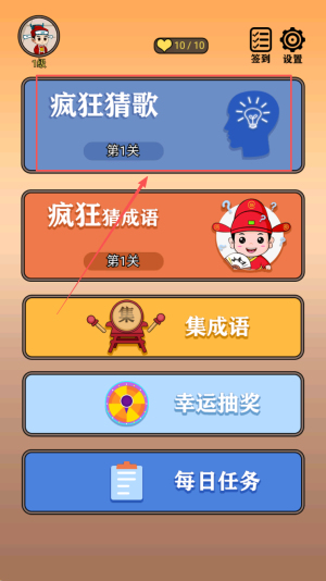 2、选择游戏:点击“疯狂猜歌”进入第1关。