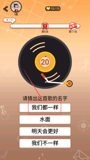 3、开始猜歌:根据播放旋律在“我们都一样”等选项中选择正确歌名。