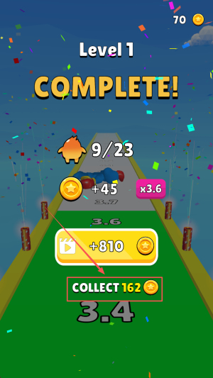 4、领取奖励:出现“Level 1 COMPLETE”后点击“COLLECT”获得162金币。