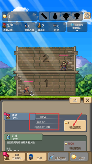 2、消耗【3】金币点击【等级提高】,可提升勇者的【HP4】-【攻击力1】等属性,强化作战能力。