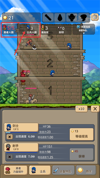 4、解锁士兵后关注【士兵人数-3】,搭配【勇者人数-5/5】的阵容,提升关卡推进效率。