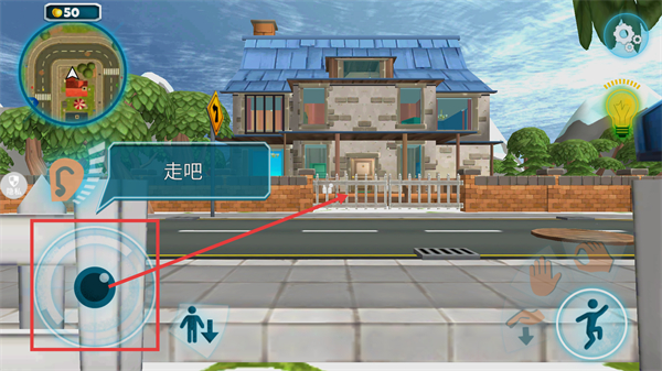 2、游戏内通过左侧的移动控制按钮操作角色移动,根据提示点击【走吧】对应的目标区域推进流程。