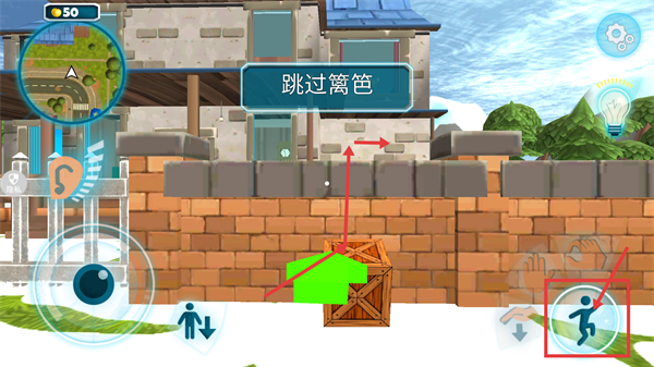 3、遇到障碍时,点击右下角的跳跃按钮,配合场景中的道具(如木箱)可实现【跳过篱笆】的操作。