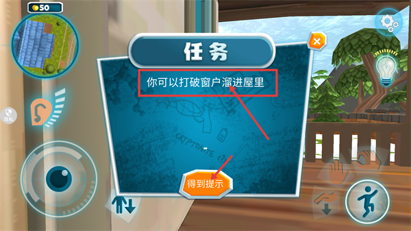4、打开【任务】界面查看提示,按照【你可以打破窗户溜进屋里】的指引推进,也可点击【得到提示】获取更多线索。