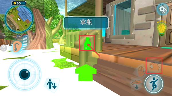 1、根据提示操作角色靠近目标,点击拾取按钮完成【拿瓶】的物品收集,瓶子是后续投掷互动的关键道具。