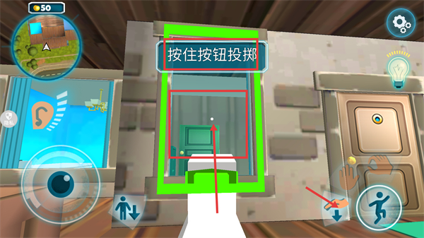 2、瞄准目标区域后,执行【按住按钮投掷】的操作,利用瓶子实现场景互动(如打破窗户)以推进流程。
