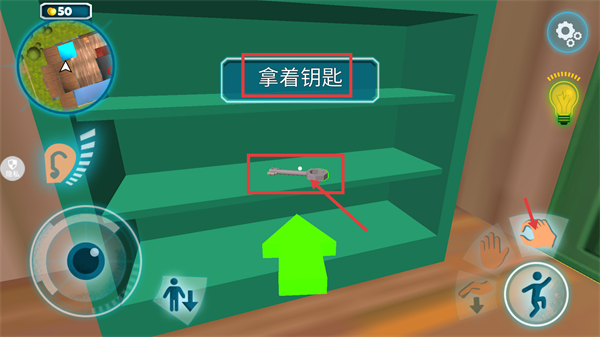 3、进入室内场景后,按指引收集【拿着钥匙】的道具,钥匙是后续解锁门锁的核心物品。