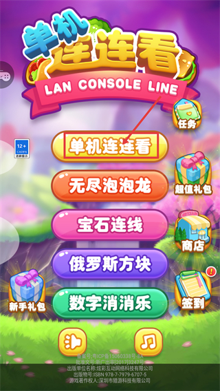 1、选择【单机连连看】模式开始游戏,该玩法需匹配相同物品消除,同时可查看【任务】等功能获取奖励。
